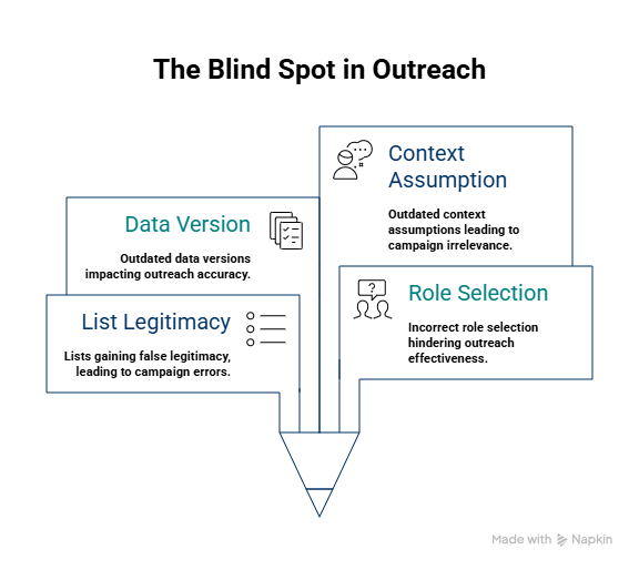 Once a list exists, it gains false legitimacy. Campaigns are built on it. Metrics are judged against it. And when things underperform, everything except the list gets blamed.